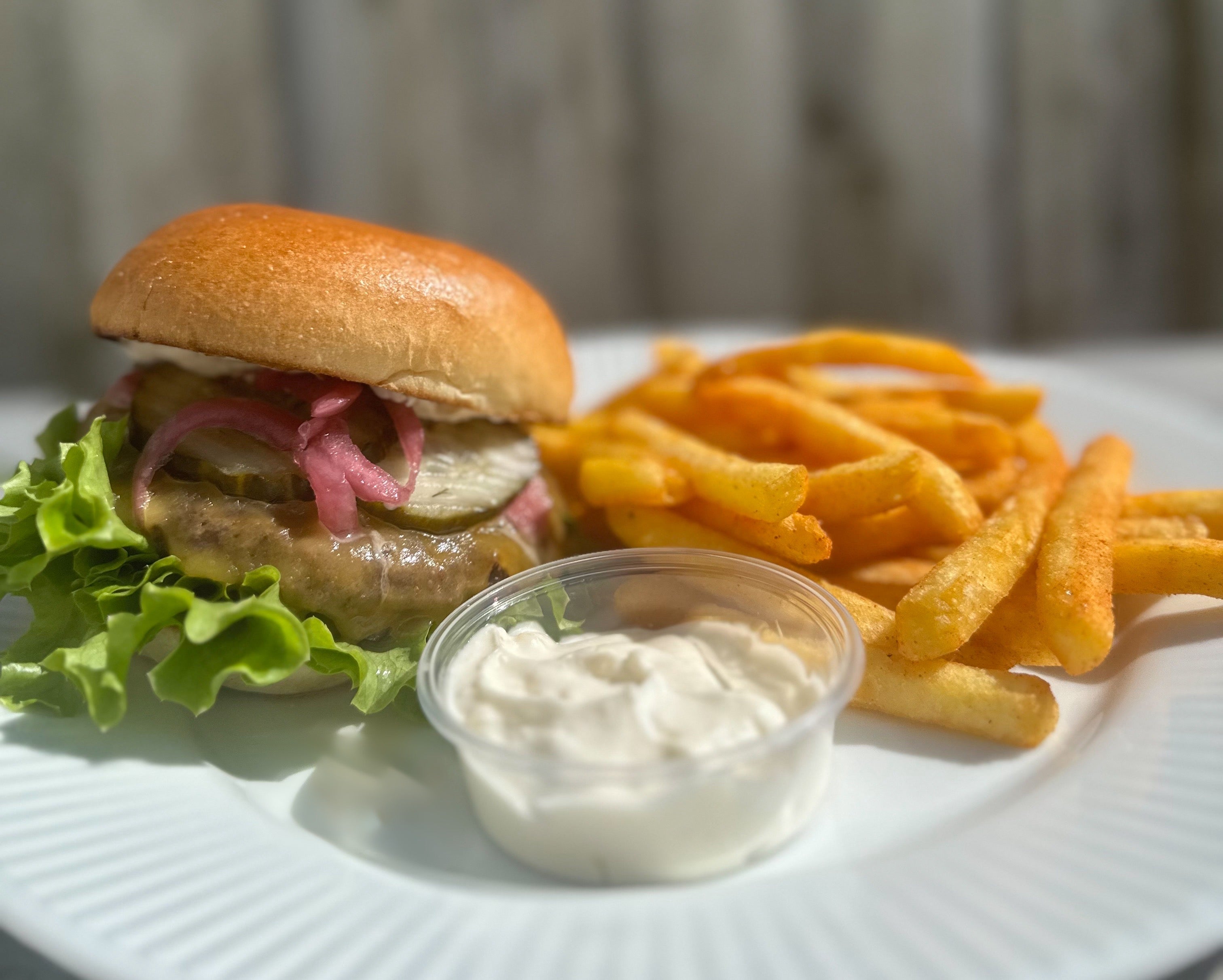 - En servering pr. person (en burger + fritter + 1 dip)